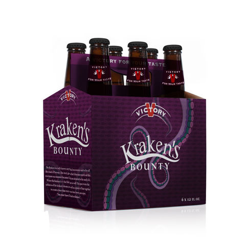 The packaging portion of this project includes bottle labels, neck labels, bottle caps, and 6-pack design for the Kraken’s Bounty beer.